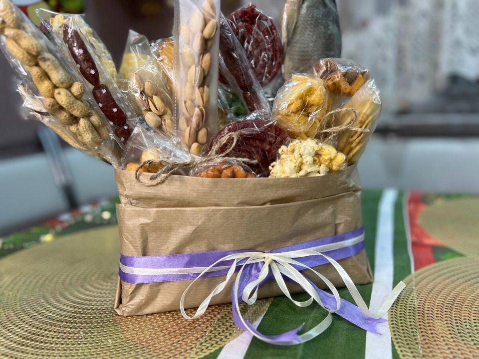 Затем пересыпьте выбранные продукты по отдельным пакетам и прикрепите их на шпажки с помощью скотча. Например, чипсы, орехи, колбаски и другие закуски можно аккуратно разместить на шпажках, что придаст буксу объем и красивый вид.