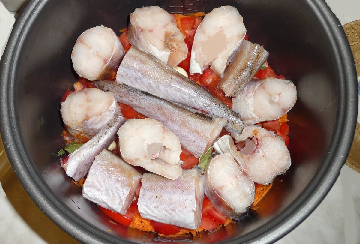 Для обогащения вкуса следует добавить томатную пасту и мелко нарезанный чеснок. Далее в овощную смесь кладут лавровые листы, специи и куски рыбы, приправленные солью. Всё тщательно перемешивается. Блюдо можно готовить как в мультиварке, так и в духовке — в первом случае потребуется 60 минут, а во втором достаточно 20 минут на умеренном огне.