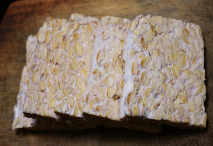 Темпе — это ферментированные соевые бобы, спрессованные в плотный «пирог».