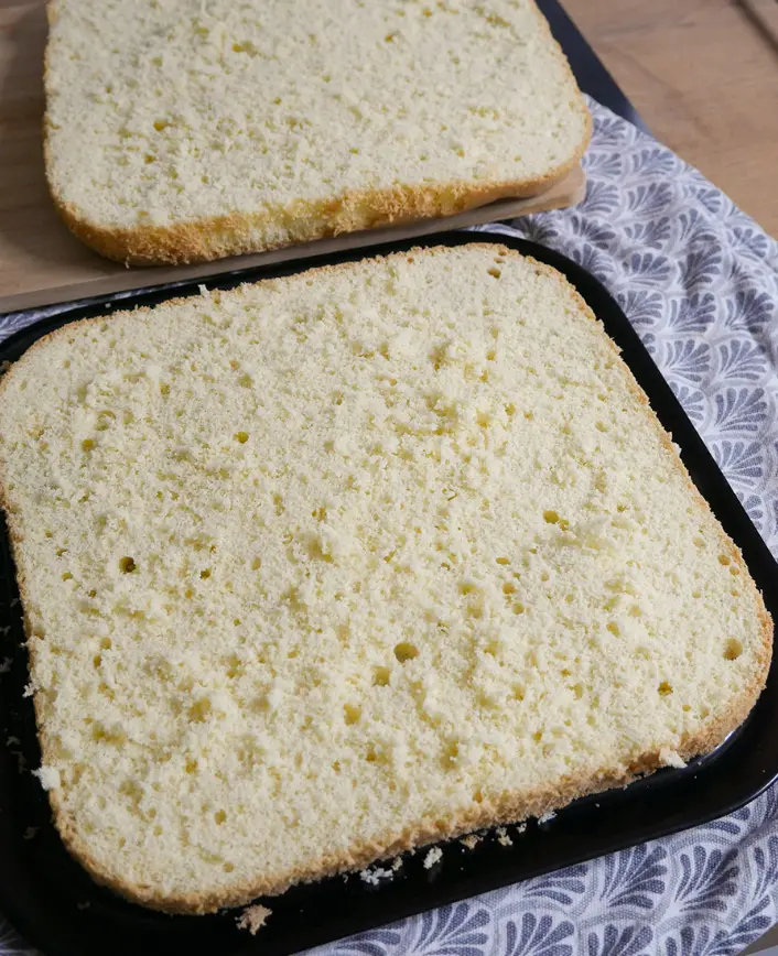 Тесто переливается в форму размером 24x24 см, предварительно застеленную бумагой для выпечки. Далее, бисквит отправляется в разогретую до 180°C духовку на 20 минут. Готовность проверяется деревянной зубочисткой: она должна выходить из теста сухой.