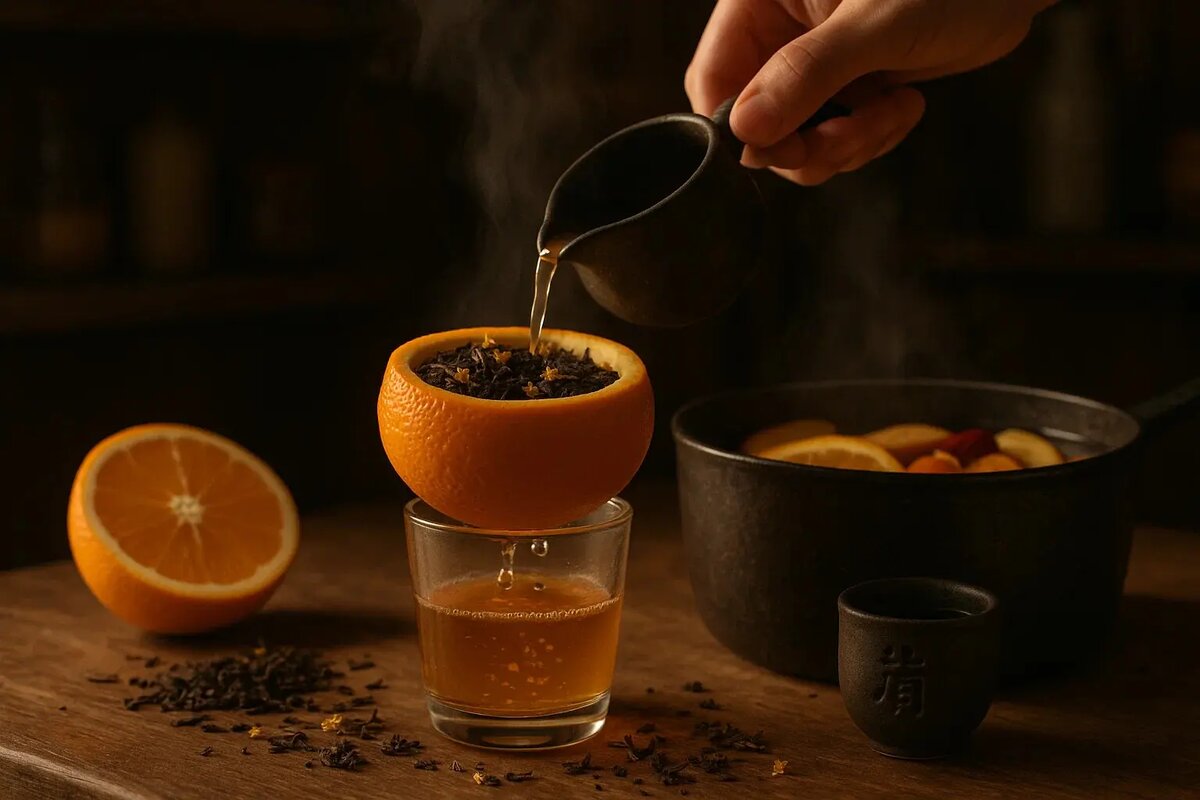 Для начала необходимо взять крупный, спелый апельсин. Его делят пополам, аккуратно извлекая мякоть, сохраняя целостность кожуры. Затем стенки апельсина прокалывают небольшими отверстиями, чтобы обеспечить выход аромата. Далее внутрь помещают черный чай и несколько лепестков османтуса — цветка, который придаст напитку нежные медовые ноты, сделав вкус гармоничным и многослойным.