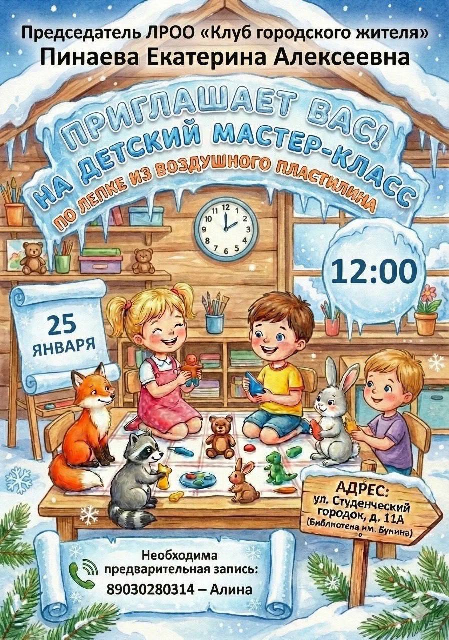 25 января в библиотеке имени И.А. Бунина пройдет творческий мастер-класс для детей, инициированный председателем «Клуба городского жителя» и депутатом городского Совета Екатериной Пинаевой.