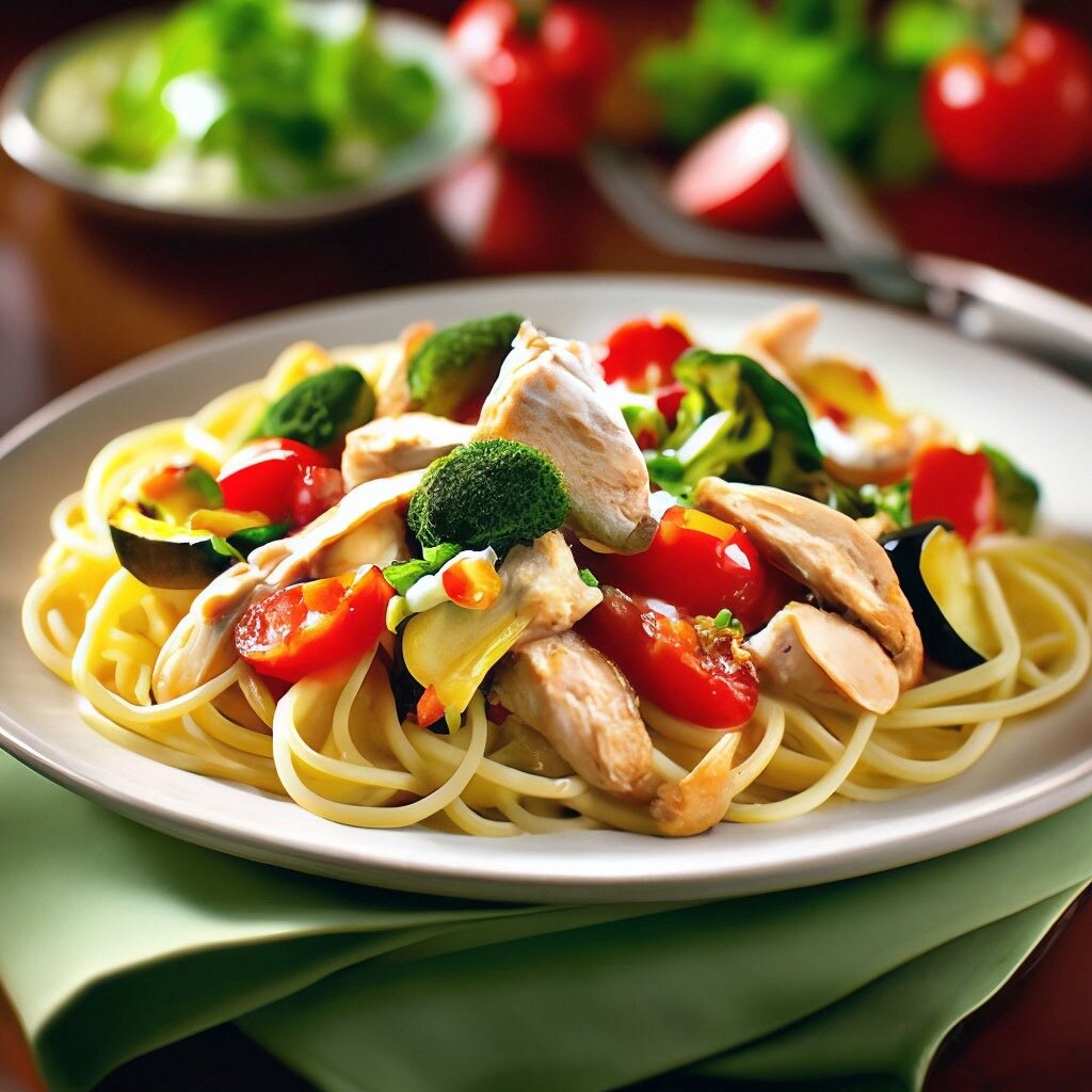 Смешать спагетти с курицей и овощами, добавить сливочное масло, посолить и поперчить по вкусу.