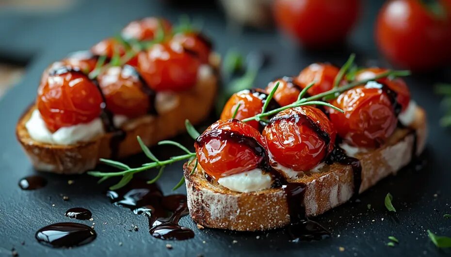 Пока помидоры готовятся, приготовьте чесночный крем. Натрите зубчик чеснока на мелкой терке и смешайте с оливковым маслом до получения однородной эмульсии. Хлеб обжарьте с обеих сторон и сразу же смажьте каждую ломтик чесночным кремом, чтобы он стал мягким и ароматным. Сверху положите карамелизованные томаты и сбрызните бальзамическим кремом, который добавит сладковатую нотку и кислинку.