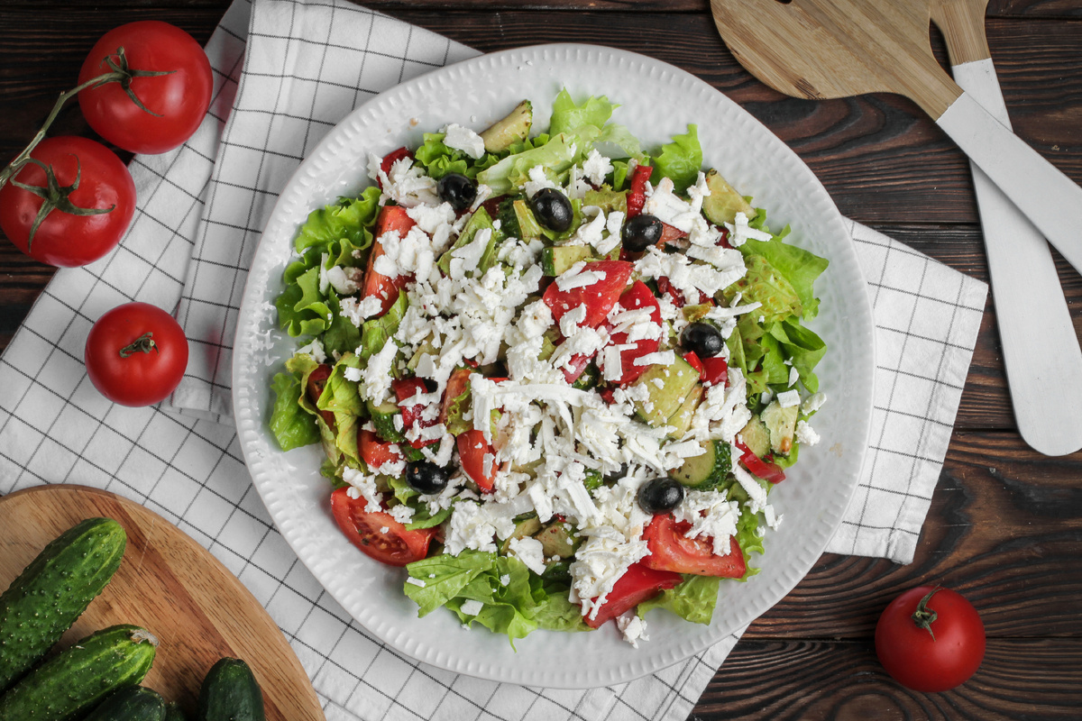 Затем соедините овощи с маслинами и подготовьте листья салата. Брынзу натрите крупной стружкой и разместите поверх салата. Финальная заправка отправляется на овощи и слегка перемешивается перед подачей. Быстро, просто и с характерной болгарской ноткой.