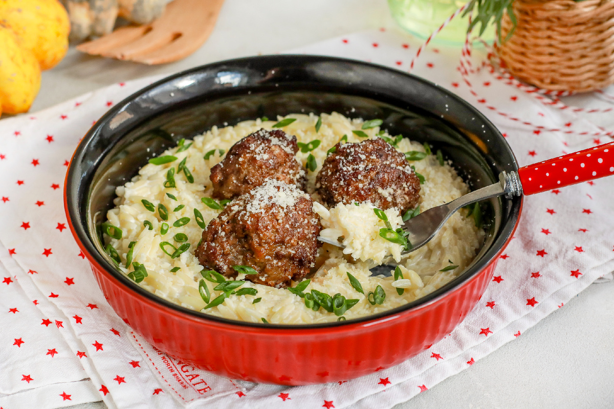 Лук прогреть на масле до мягкости, соединить с домашним фаршем и солью. Формируем круглые небольшие котлетки, которые зажариваются до румяности и затем запекаются вместе с орзо. Зеленый лук добавляет свежую ноту, а пармезан — завершающий акцент в подаче.