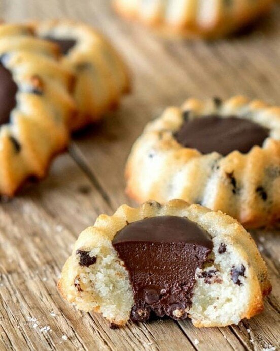 Переложить финансье на пергамент и в центр каждого добавить немного шоколадных шариков. Залить ганашем, пока он ещё жидкий. Хранить в холодильнике, но перед подачей дайте постоять, чтобы шоколад слегка размягчился.