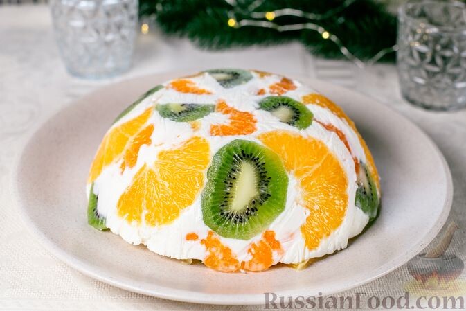Этот легкий десерт сочетает в себе сметану и творог, а также яркие фрукты, такие как апельсины, мандарины и киви. Не требует сложного приготовления, а эффектный внешний вид украсит любой стол.