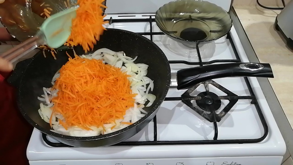 Начните с нарезания лука соломкой. На сковороде разогрейте немного растительного масла и добавьте лук, заливая его 50 мл воды. Готовьте смесь под крышкой около 5 минут. Затем натрите морковь и продолжайте готовить еще 5 минут, периодически помешивая. Приправьте овощи солью и перцем по вкусу.