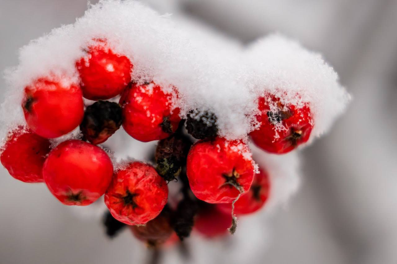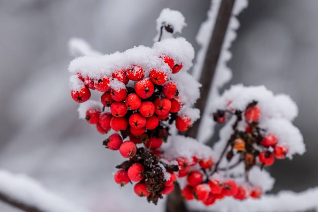 Идеальный день, чтобы заметить, как на белом фоне ярче вспыхивает красная гроздь рябины.