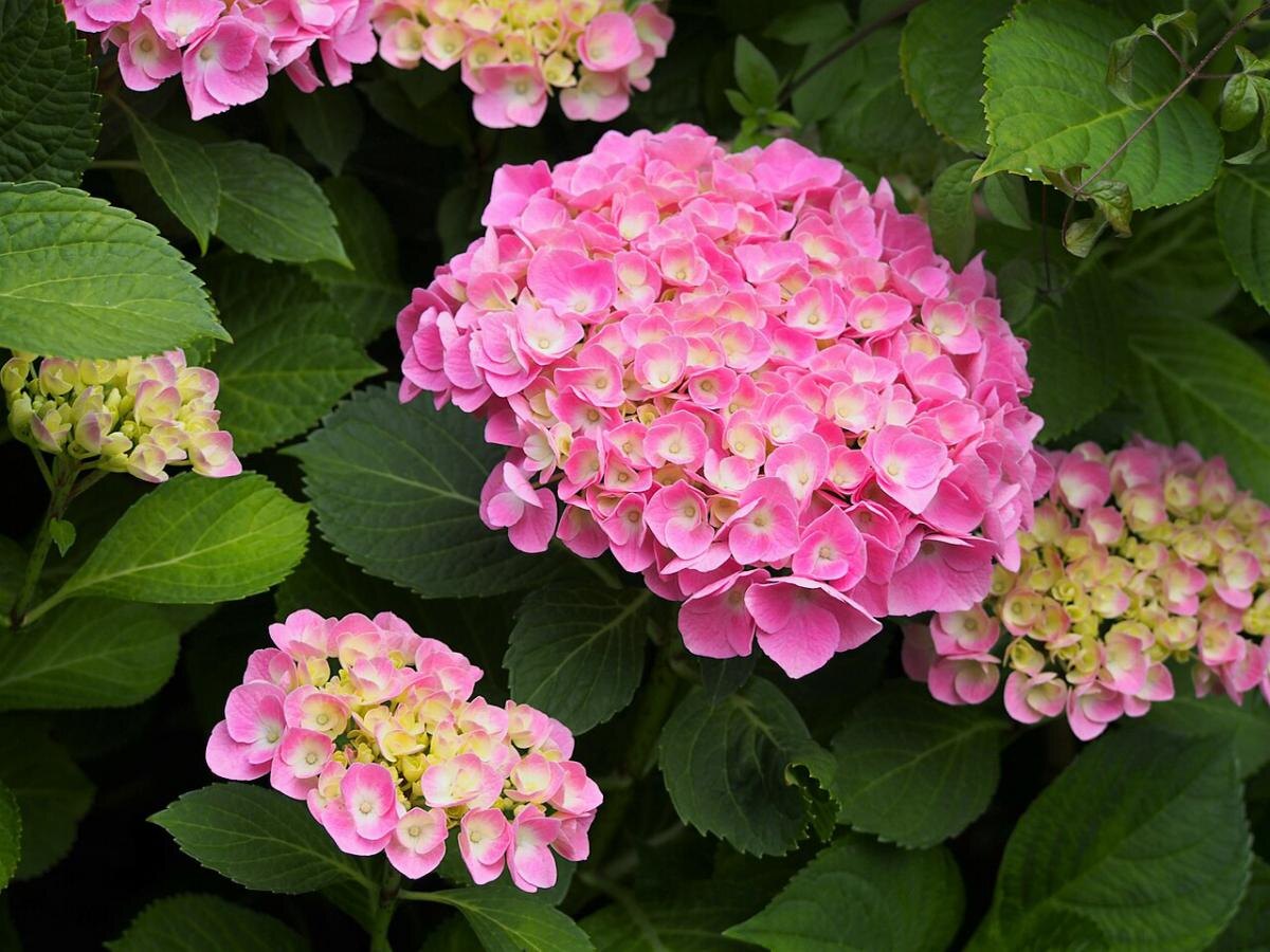 - Гортензия крупнолистная (Hydrangea macrophylla): Сражает воображение своими крупными соцветиями, цветет на старых и молодых побегах.