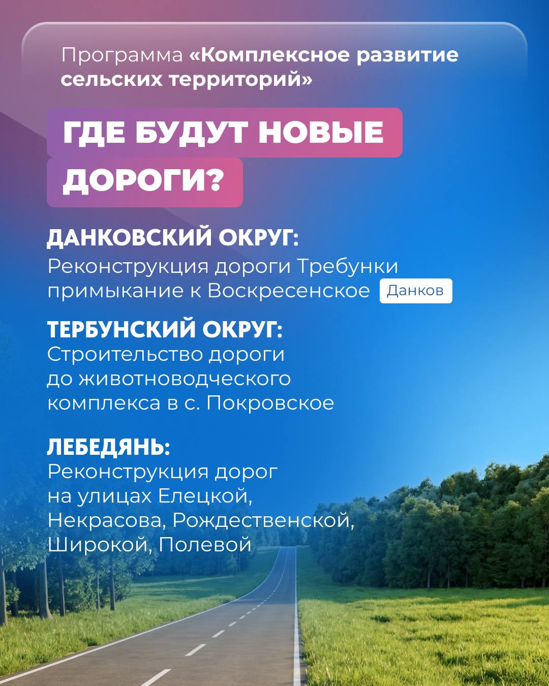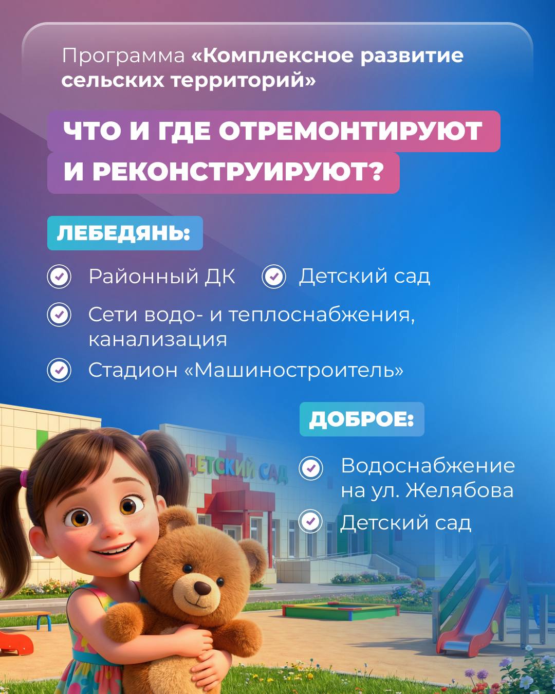 Сделать так много нам поможет участие в программе «Комплексное развитие сельских территорий». Многие проекты крупные. Одних только домов и квартир для аграриев и работников соцсферы – 115. Несколько больших строек – ледовый дворец в Лебедяни, ФОК в Данкове, школа и общественный центр в Добром. Плюс ремонты детских садов, спортивных объектов, дорог, инженерных сетей.