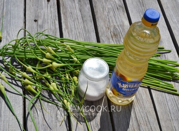- Соберите ингредиенты — это всего лишь три простых компонента: 300 г свежих стрелок чеснока, 2 ст.л. подсолнечного масла и 1 ч.л. соли. Обязательно выберите молодые стрелки, они более нежные и ароматные.
