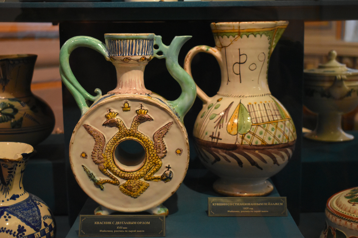 Гжельская майолика представляет собой керамическую посуду с многоцветной росписью. Изделия получали эмаль белого цвета, и после обжига художники наносили яркие рисунки, вдохновленные природой и жизнью. Главное внимание в коллекции уделяется квасникам, кууди?штанам и чашкам, выполненным в разнообразной палитре цветов.