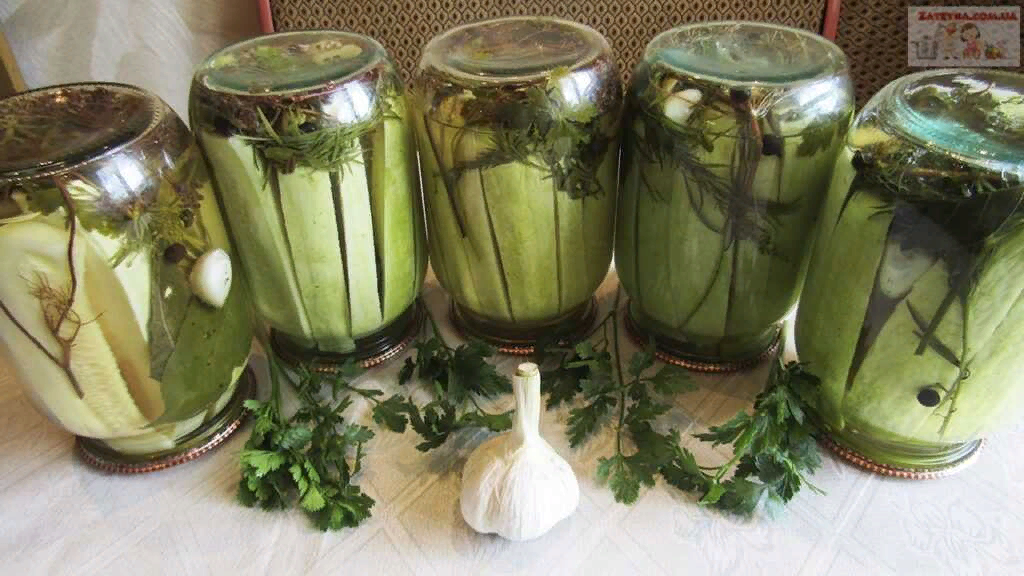 В большую кастрюлю на дно укладывают полотенце, ставят банки и заливают их теплой водой до уровня плечиков. Крышки в процессе стерилизации не закручиваются. Стерилизация занимает 5 минут, после чего банки плотно закрывают и переворачивают. Вот и всё! Хрустящие кабачки на зиму готовы для хранения.