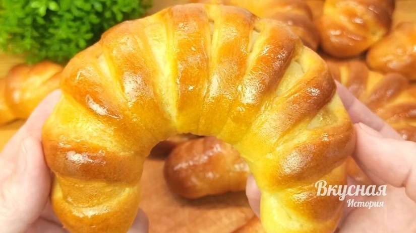 8. Чтобы добиться глянцевой корочки, приготовьте сахарный сироп: в 50 мл воды растворите 2 ст. л. сахара и доведите до кипения. Готовые рогалики сразу же смажьте горячим сиропом.
