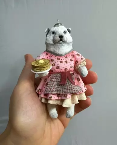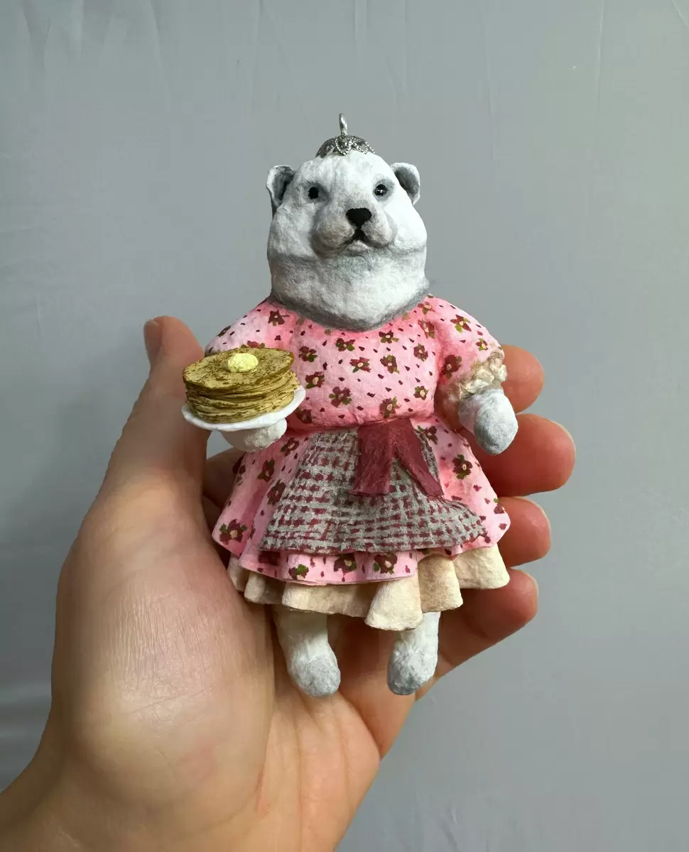 Эта белоснежная медведица в цветочном платье была создана на мастер-классе, где процесс творения стал важнее готового изделия. Платье с подъюбником олицетворяет щедрость Масленицы, а фартук добавляет живости образу. В руках у медведицы — тарелка с настоящими блинами, а над ними кружится кусочек масла, дарящий сцене атмосферу тепла и уюта.