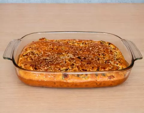 3. Выпекание: Разогрейте духовку до 180 °C. Вылейте половину теста в форму и равномерно распределите. Сверху выложите остывшую начинку и покройте оставшимся тестом. Посыпьте семечками кунжута. Выпекайте пирог около 40 минут. Готовый пирог дайте немного остыть в форме и подавайте как горячим, так и холодным.