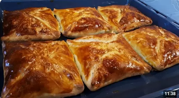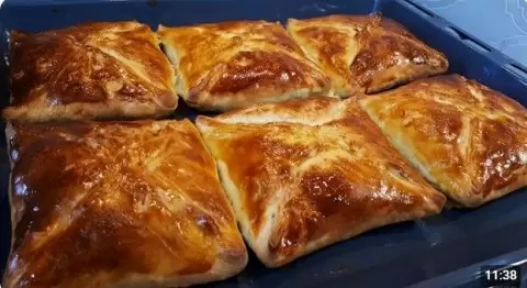 Когда тесто подошло, перенесите его на стол и разделите на 6 равных частей. Сформируйте из них небольшие шары и оставьте на 10 минут. Затем раскатайте каждый шар в тонкий прямоугольник, смажьте сливочным маслом и сложите по предложенному в видео рецепте способу. После этого немного раскатайте полученные заготовки, выложите начинку в центр и заверните в виде конверта.