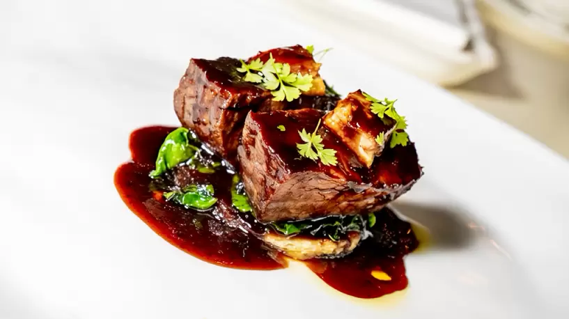 - Мясное меню: Говяжий стейк с трюфельным соусом и фуа-гра, а на десерт — «Наполеон» с ванильным мороженым и клубникой.