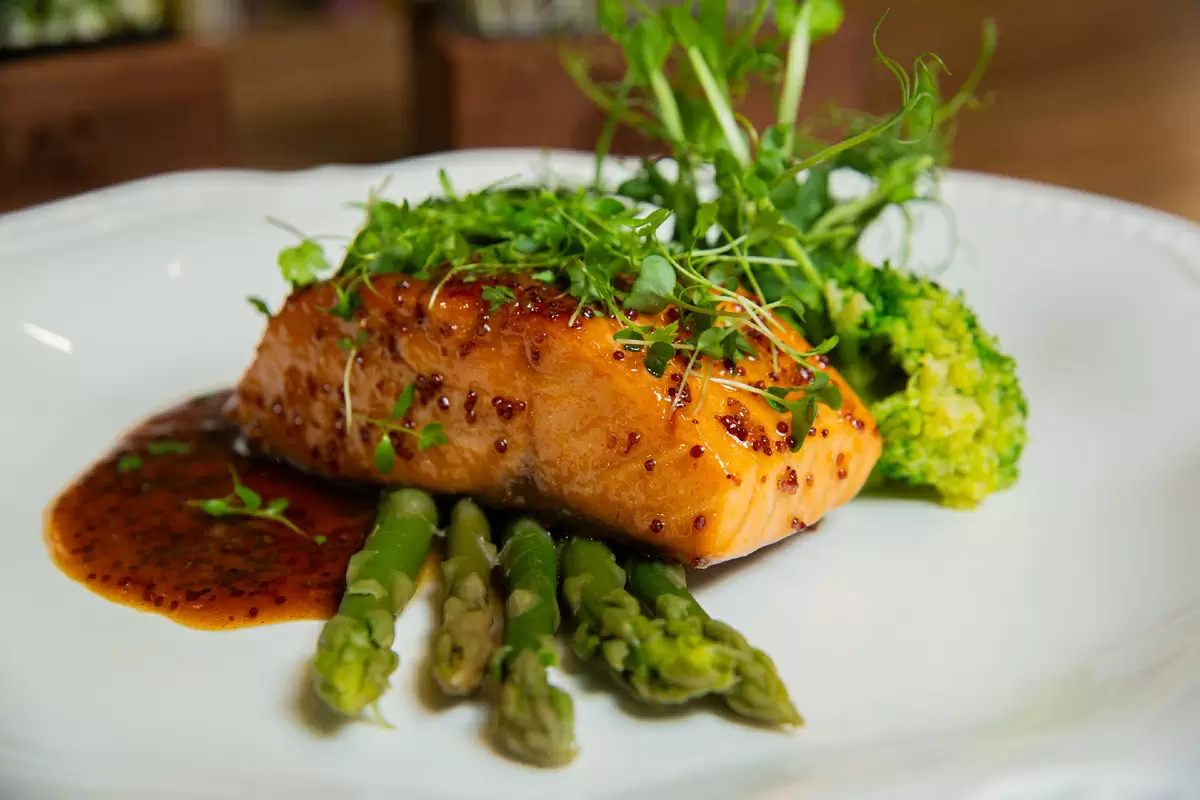 На тарелке красиво расположите спаржу, добавьте нежный стейк лосося, порцию пюре и отварную брокколи. Поверх выложите оставшуюся глазурь, а для заключительного штриха добавьте микрозелень. Это не только усиливает вкус, но и придает изысканный вид блюду.