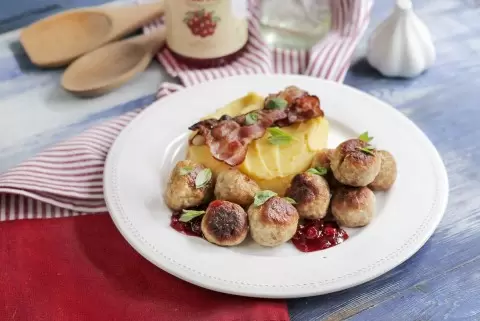 Шаг 3: На разогретой сковороде с 1 столовой ложкой растительного масла обжаривайте фрикадельки на среднем огне в течение 10-12 минут, периодически переворачивая их, чтобы они равномерно подрумянились. В другой сковороде без масла обжарьте бекон с обеих сторон до золотистой корочки в течение 1-2 минут. На тарелки выложите пюре, фрикадельки и бекон, а также подайте брусничный соус.
